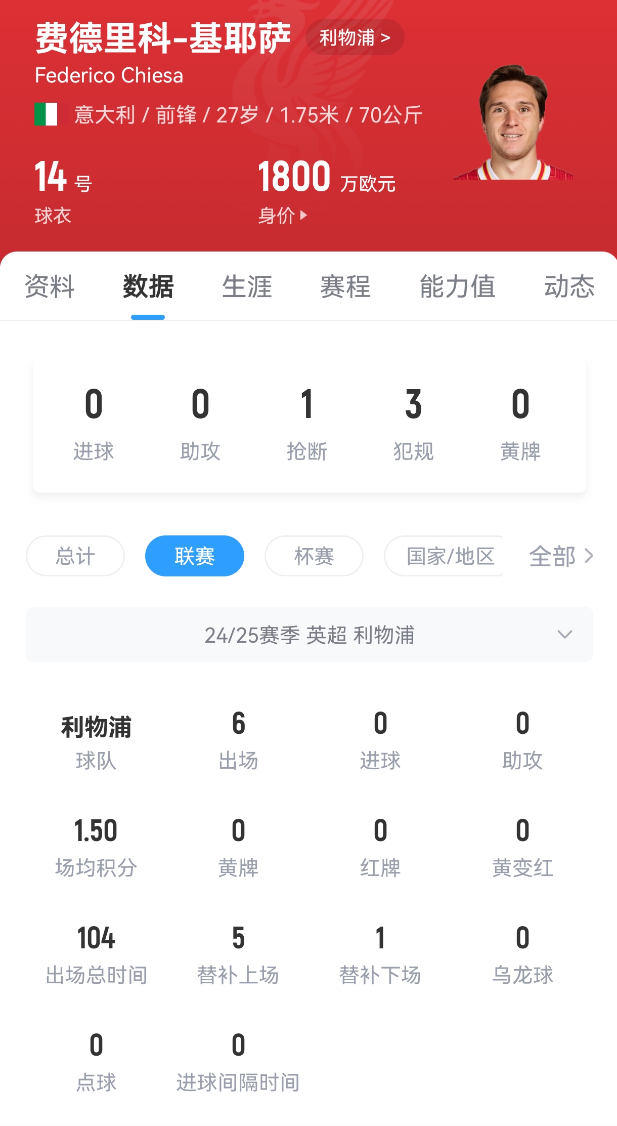 基耶萨在去年以1200万欧的价格从尤文加盟利物浦,他出场14次贡献2球2助。